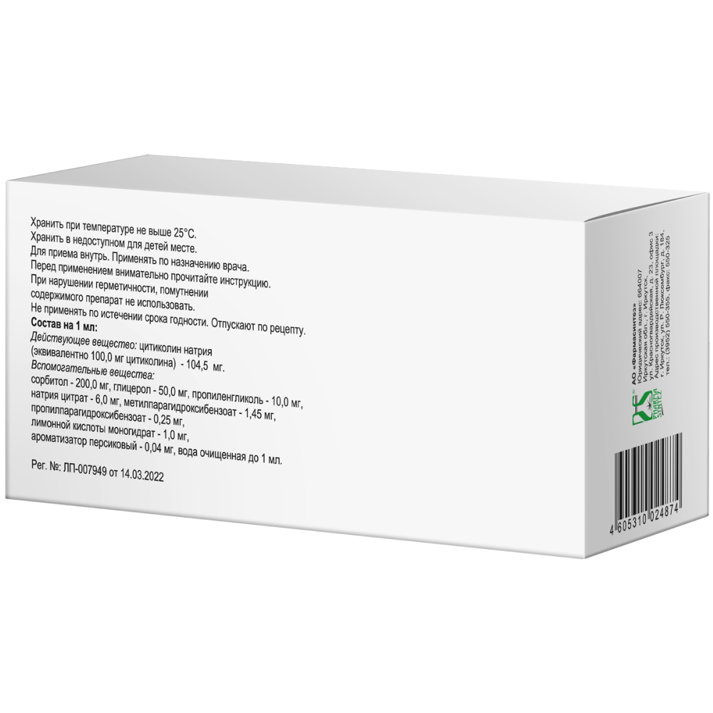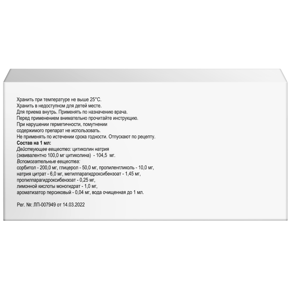 Действующее вещество: цитиколин натрия (эквивалентно 100,0 мг цитиколина) - 104,5 мг.