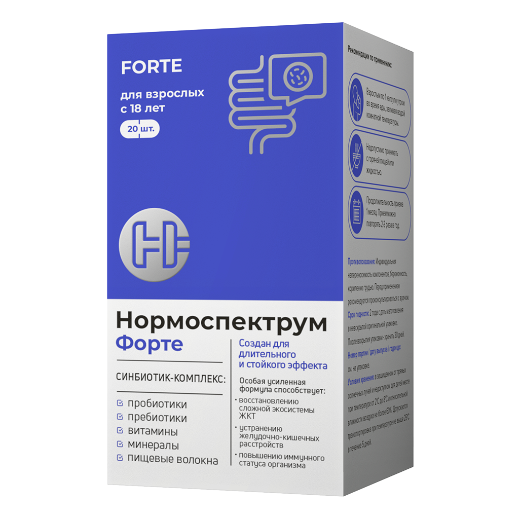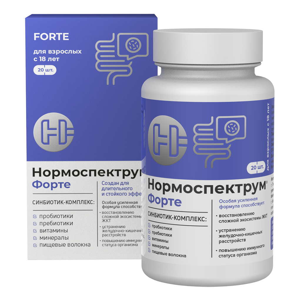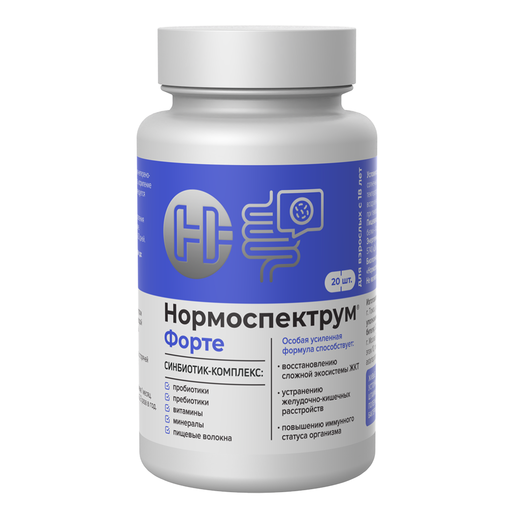 В мультикомпонентном синбиотик – комплексе «Нормоспектрум®- Форте» консорциум пробиотиков специально подобран с учетом особенностей состава микрофлоры взрослого человека и содержит виды и штаммы живых бактерий (B.adolescentis, B.longum, L.acidophilus, B.bifidum, и т.д.), которые наиболее физиологичны для организма взрослого человека.