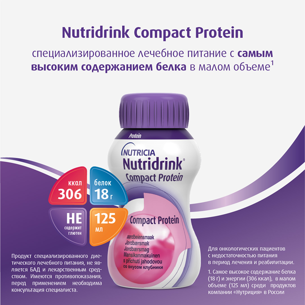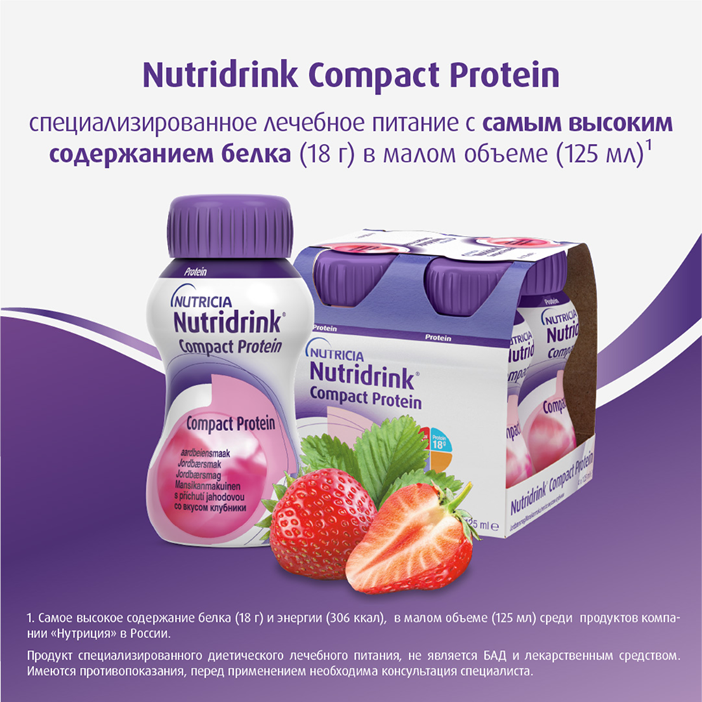 НУТРИДРИНК КОМПАКТ ПРОТЕИН КЛУБНИКА СМЕСЬ 125МЛ N4 - жидкая, готовая к употреблению, высокобелковая, высококалорийная смесь. Предназначена для взрослых пациентов с недостаточностью питания или риском ее развития.