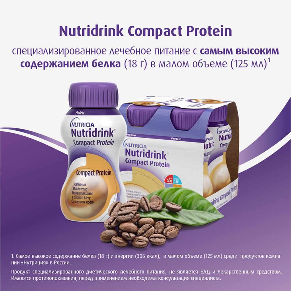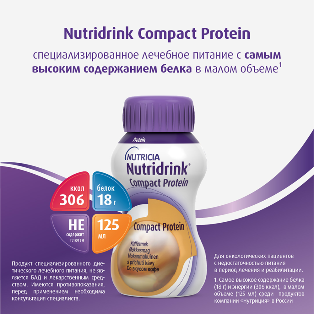 НУТРИДРИНК КОМПАКТ ПРОТЕИН КОФЕ СМЕСЬ 125МЛ N4 - жидкая, готовая к употреблению, высокобелковая, высококалорийная смесь. Предназначена для взрослых пациентов с недостаточностью питания или риском ее развития.