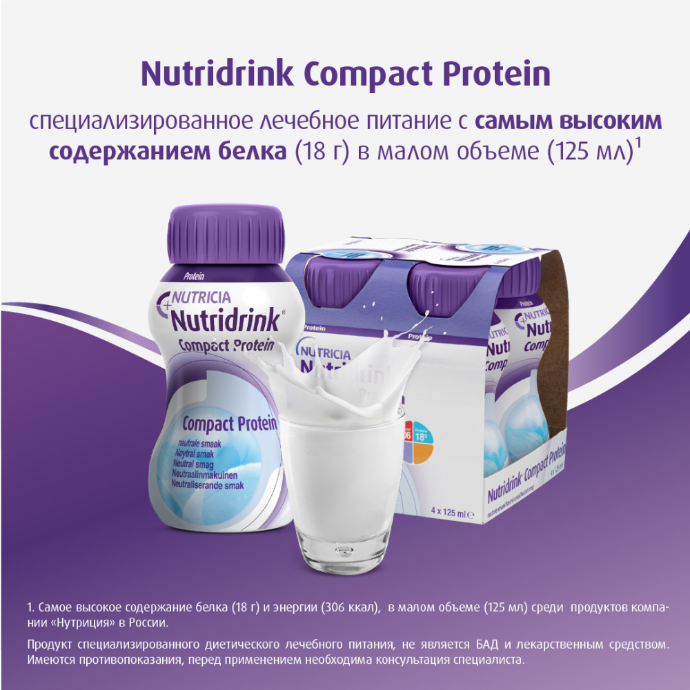 Специализированный пищевой продукт диетического лечебного питания, жидкая готовая к употреблению, высокобелковая, высококалорийная смесь «Нутридринк Компакт Протеин» с нейтральным вкусом - это cбалансированный по составу продукт для энтерального питания взрослых пациентов (старше 18 лет) с недостаточностью питания или риском ее развития. Одна бутылочка «Нутридринк Компакт Протеин» 125 мл содержит 18 г белка, 306 ккал, 13