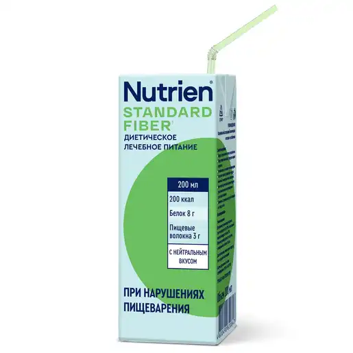 Nutrien Standard Fiber (Нутриэн Стандарт с пищевыми волокнами) - полноценное лечебное питание, готовое к употреблению для профилактики и устранения недостаточности питания, а также коррекции состава рациона питания. Композиция растворимых и нерастворимых пищевых волокон и пребиотиков нормализует процесс пищеварения, обладает пребиотическим и антиатерогенным действием. Жидкая готовая смесь объемом 200 мл в упаковке Tetra Pak с нейтральным вкусом. К упаковке прилагается одноразовая трубочка.