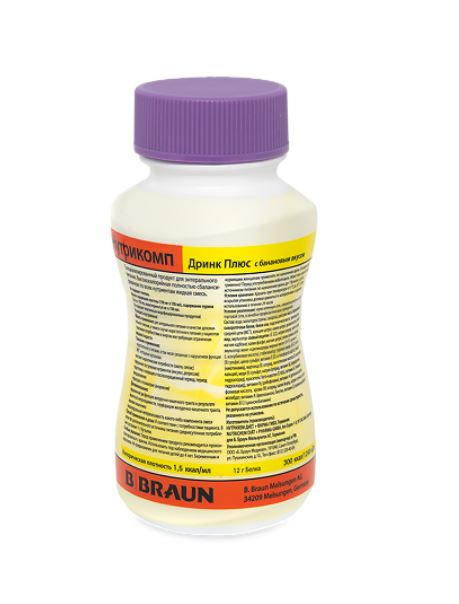 Полностью сбалансированная по всем нутриентам жидкая смесь для энтерального питания для специальных медицинских целей. Для предупреждения недостаточности питания. Ключевые характеристики: Высокое содержание энергии (1 мл = 1,5 ккал или 300 ккал/бут.) Не содержит глютена и холестерина, минимальное содержание лактозы и пурина(Нутрикомп Дринк плюс с шоколадным вкусом содержит повышенное количество пурина 58,5 мг/100 мл из порошка какао) Максимально полноценный белковый состав представлен комбинацией молочного и соевого протеинов Жировой компонент представлен комбинацией рапсового масла, подсолнечного масла, МСТ и рыбьего жира Углеводы представлены мальтодекстрином Распределение энергетической ценности: белки : жиры : углеводы : ПВ (% ккал) = 16 : 30 : 54 : 0 Не содержит глютен.