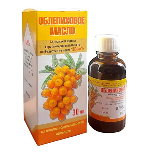 Наружно: при поражениях кожи применяют в виде масляных повязок. На предварительно очищенный от некротических тканей участок кожи наносят облепиховое масло, а затем накладывают ватно-марлевую повязку, которую меняют через день. Лечение проводят до появления грануляций. В оториноларингологии - при тимпанопластике, после обработки раны антибиотиками или гидрокортизоном, тампонами, обильно пропитанными облепиховым маслом, тампонируют раневую поверхность. Курс лечения - 7-10 процедур.