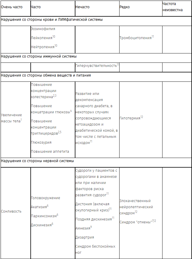 Наиболее частыми нежелательными реакциями (наблюдавшимися у ≥1% пациентов), связанными с приемом оланзапина во время клинических исследований, были сонливость, увеличение массы тела, эозинофилия, повышение концентрации пролактина, холестерина, глюкозы и триглицеридов, глюкозурия, повышение аппетита, головокружение, акатизия, паркинсонизм, лейкопения, нейтропения, дискинезия, ортостатическая гипотензия, антихолинергические эффекты, преходящее бессимптомное повышение концентрации аминотрансфераз печени, сыпь, астения, утомляемость, лихорадка, артралгия, повышение концентрации щелочной фосфатазы, высокая концентрация гамма-глутамилтраснферазы, мочевой кислоты, креатинфосфокиназы и отек.