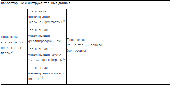 8 В клинических исследованиях продолжительностью до 12 недель концентрация пролактина в плазме превышала верхнюю границу нормы у, приблизительно, 30% пациентов с нормальными исходными показателями пролактина. У большинства таких пациентов увеличение концентрации пролактина было умеренным, и менее чем в 2 раза превышало верхнюю границу нормы.