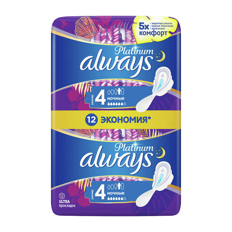 Always Platinum более комфортны (по сравнению с Always Ultra) благодаря тысячам микроподушечек и новым, мягким как шелк крылышкам. Они также обеспечивают лучшую защиту (по сравнению с Always Ultra) благодаря защитным боковым барьерам и ультравпитывающему внутреннему слою, который запирает влагу внутри. Always Platinum Ночные (Размер 4) с крылышками рекомендованы для ночного использования или для дневного использования при обильных выделениях.