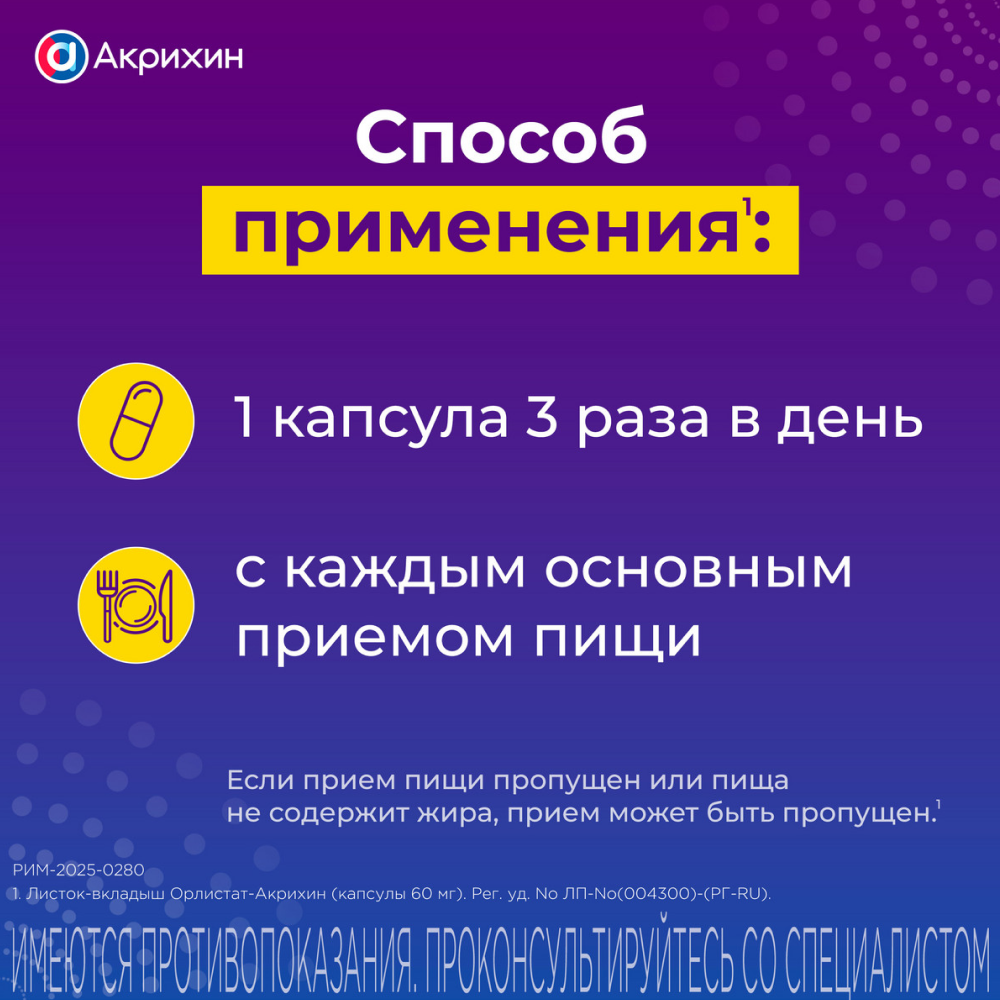 Внутрь, запивая водой, в рекомендуемой дозе 60 мг перед каждым основным приемом пищи, вместе с пищей или не позднее, чем через час после приема пищи. Если прием пищи пропускают или пища не содержит жира, прием орлистата также можно пропустить. В течение 24 часов не следует принимать более 3 капсул по 60 мг.
