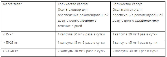 Рекомендованный режим дозирования осельтамивира капсулы 30 и 45 мг или экстемпорально приготовленной суспензии