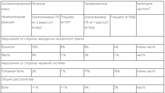 В таблице 1 представлены HP, возникавшие наиболее часто (≥1 %) при приеме рекомендованной дозы осельтамивира в исследованиях по профилактике и лечению гриппа у взрослых и подростков (75 мг 2 раза в сутки в течение 5 дней для лечения и 75 мг 1 раз в сутки до 6 недель для профилактики), и частота которых как минимум на 1 % выше по сравнению с плацебо. В исследования по лечению гриппа вошли взрослые/подростки без сопутствующей патологии и больные группы риска, т.е. пациенты с высоким риском развития осложнений гриппа (пациенты пожилого и старческого возраста, пациенты с хроническими заболеваниями сердца или органов дыхания). В целом профиль безопасности у пациентов группы риска соответствовал таковому у взрослых/пациентов подросткового возраста без сопутствующей патологии.