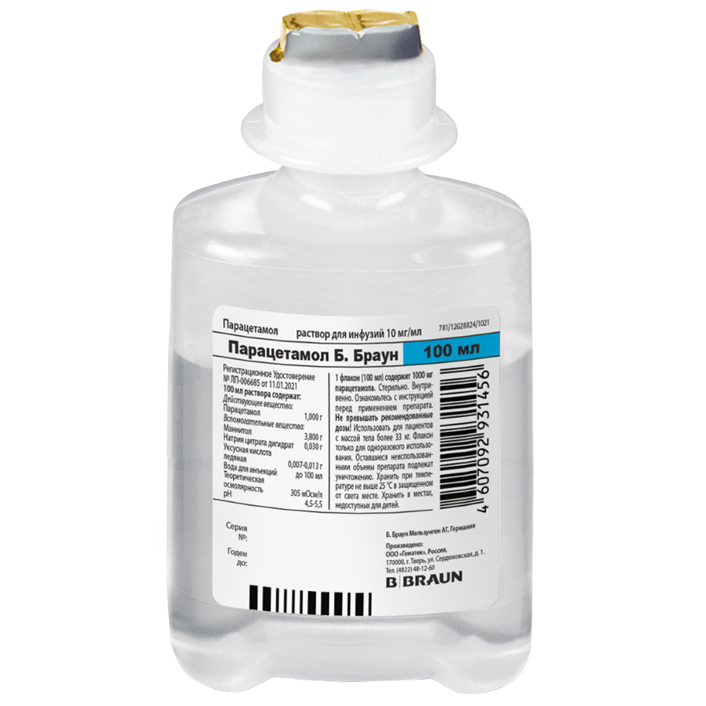 Обезболивающее действие парацетамола наступает в течение 5-10 мин после начала инфузии и достигает максимума через 1 час; длительность действия от 4 до 6 ч.
