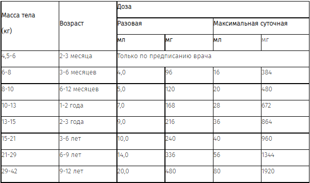 При использовании мерного шприца, в зависимости от массы тела ребенка, разовая и максимальная суточная дозы препарата будут составлять: