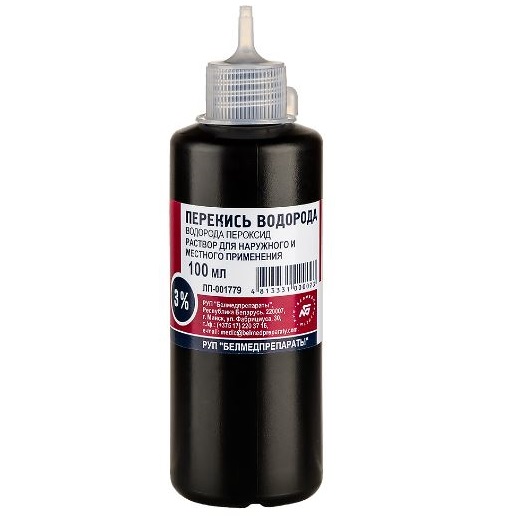 Перекиси водорода – 3 г Натрия бензоата – 0,05 г Воды очищенной – до 100 мл