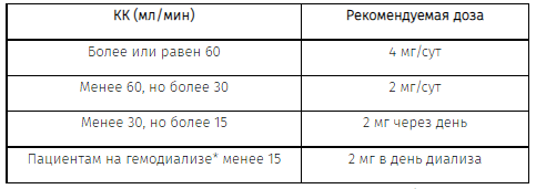 У пациентов пожилого возраста лечение следует начинать с дозы 2 мг в сутки, и в дальнейшем, при необходимости, через 1 месяц после начала терапии дозу можно увеличить до 4 мг в сутки, а затем до максимальной дозы - 8 мг в сутки с учетом состояния функции почек (см. табл. 1).