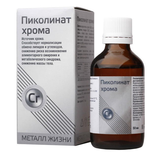 Взрослым — по 10-20 капель (0,5-1,0 мл) 1-2 раза в день, но не более 20 капель (1 мл) в день, что соответствует 200 мкг хрома.