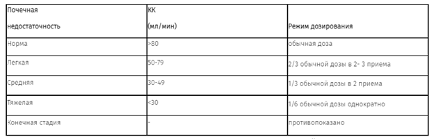 Пациентам пожилого возраста дозу корректируют при наличии почечной недостаточности, при длительной терапии необходим контроль функционального состояния почек.