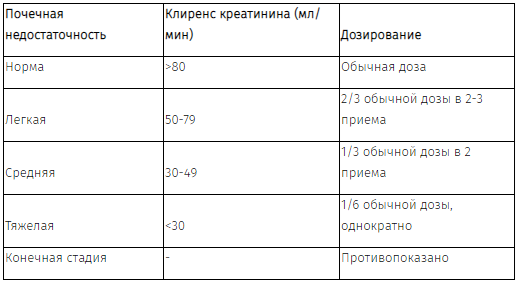 Пожилым больным доза корригируется при наличии почечной недостаточности и при длительной терапии необходим контроль функционального состояния почек.