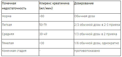 Пожилым больным доза корригируется при наличии почечной недостаточности и при длительной терапии необходим контроль функционального состояния почек.