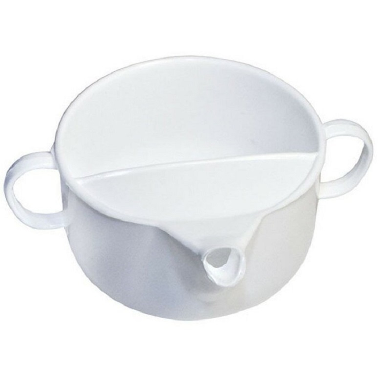 — Белый пластиковый поильник с полукрышкой, носиком и двумя ручками;