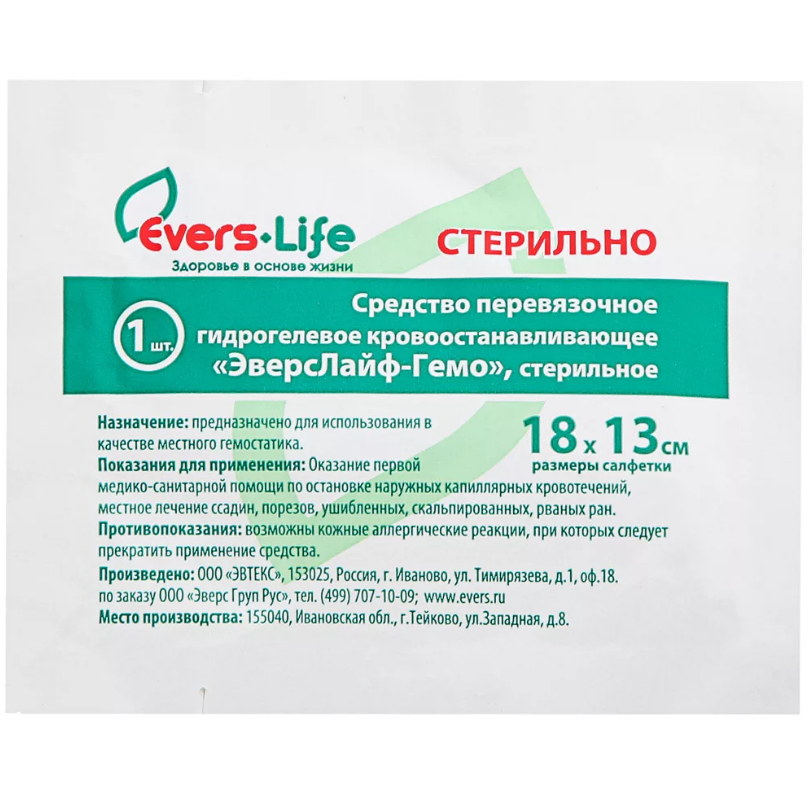 «ЭверсЛайф-Гемо» представляет собой салфетку, пропитанную биологически активным низковязким гидрогелем на основе хитозан-желатинового полиэлектролитного комлекса с иммобилизованными фармсубстанциями аминокапроновой кислоты, кальция глюконата, лидокаина и хлоргесидина, нанесенный на салфетку из нетканого полотна размером 18 х 13 см.