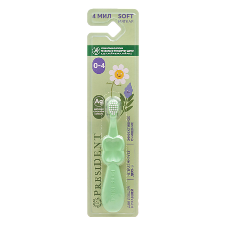 Мягкая зубная щетка PRESIDENT ® для детей от 0 до 4-х лет. Зубная щетка для ежедневного ухода за молочными зубами, с момента появления первого зубика. • С увеличенным количеством щетинок - 2500 штук - эта зубная щетка обеспечивает эффективное очищение зубов и десен. • Специально подобранная жесткость щетины 4МИЛ обеспечивая деликатное очищение от остатков пищи и налета. Идеально закругленные и отполированные щетинки не травмируют нежные десны. • Щетинки с ионами серебра обеспечивают антибактериальный эффект. • Специальная форма обеспечивает правильную фиксацию во взрослой и детской руке, а уникальная ручка подходит для левшей и правшей, обеспечивая максимальный комфорт использования. • Не содержит Бисфенол А