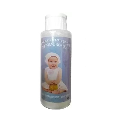 Присыпка детская Дюймовочка- это порошок для наружного применения, который содержит натуральные компоненты. В составе присыпки тальк, крахмал картофельный, цинка оксид.