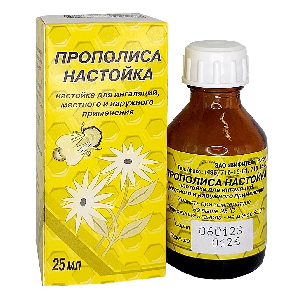 Наружно, местно, ингаляционно. Участки с поверхностными повреждениями кожных покровов (микротравмами) обрабатывают тампоном, смоченным настойкой прополиса, 1-3 раза в день. При хронических гнойных отитах после тщательной очистки от гноя в ухо вводят тампон, пропитанный настойкой прополиса, на 1-2 мин 2-3 раза в день или по 1-2 капли в ухо 3-4 раза в день.