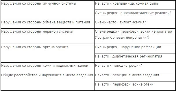 На начальной стадии инсулинотерапии могут возникать нарушение рефракции, периферические отеки и реакции в месте введения препарата (включающие боль, покраснение, крапивницу, воспаление, гематому, припухлость и зуд в месте инъекции). Эти симптомы обычно носят временный характер, быстрое улучшение контроля гликемии может приводить к состоянию "острой болевой нейропатии", которая обычно является обратимой.