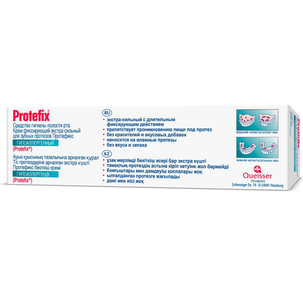 Протезы и полости рта очистить от остатков пищи. На влажные протезы нанести тонкой прерывистой линией фиксирующий крем Protefix экстра-сильный (в углубления на зубных протезах верхней и нижней челюсти, которые затем ложатся на десны). При необходимости можно нанести полоску фиксирующего крема и на заднюю часть десневой пластины протеза верхней челюсти. Затем вставьте протез и на несколько секунд прижмите его к деснам. В течение 5 минут не принимать пищу.