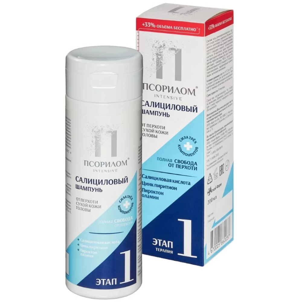 ПСОРИЛОМ ШАМПУНЬ САЛИЦИЛ ПРОТИВ СУХОЙ ПЕРХОТИ - благодаря силе трех активных компонентов шампунь эффективно устраняет 100% видимой перхоти и предотвращает ее повторное появление.