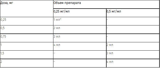 Дети от 6 месяцев и старше: 0,25-0,5 мг в сутки. При необходимости доза может быть увеличена до 1 мг/сутки.