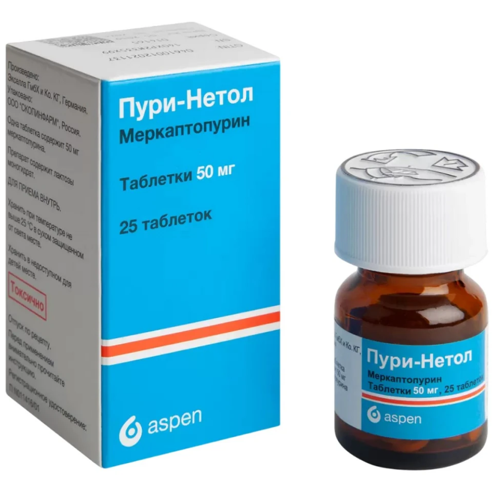 Действующее вещество: меркаптопурин 50,0 мг.