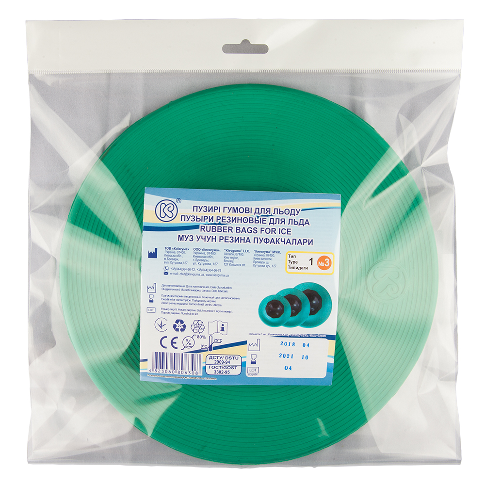 Пузырь для льда резиновый - изготовлен из резины в виде плоского блина с широким отверстием и плотно завинчивающейся пробкой, - предназначен для местного охлаждения тела, используется многократно. Пузырь со льдом резиновый является хорошим отвлекающим средством, вызывающим сужение кровеносных сосудов кожи. Применяется при кровотечениях, ушибах, укусах насекомых, для уменьшения болей в начальных стадиях острых воспалительных процессов, так как в нем длительное время сохраняется низкая температура.