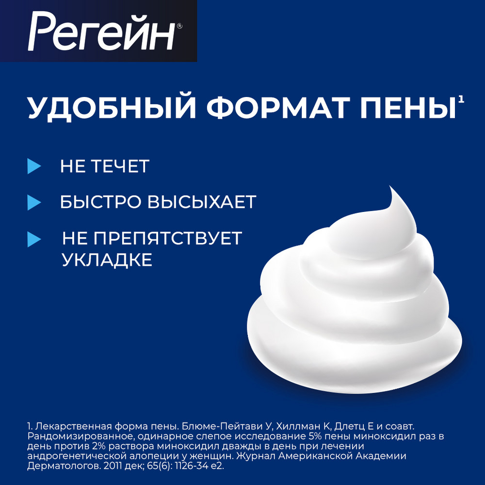 Доза для женщин: 1 г (половину колпачка) аэрозоля наносить 1 раз в сутки на пораженные участки волосистой части головы. Не следует применять препарат Регейн® чаще, чем 1 раз в сутки. Суточная доза не должна превышать 1 г препарата (50 мг миноксидила).