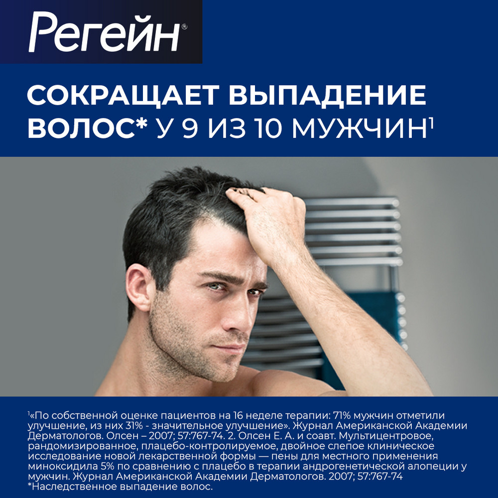 Появление первых признаков приостановления выпадения волос и восстановления роста волос возможно после применения лекарственного препарата Регейн® 2 раза в сутки у мужчин в течение 2-4 месяцев и 1 раз в сутки у женщин в течение 3-6 месяцев.