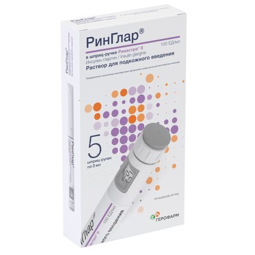 Время развития гипогликемии зависит от профиля действия применяемых препаратов инсулина и может, таким образом, изменяться при смене схемы лечения. Вследствие увеличения времени поступления в организм инсулина длительного действия при применении препарата РинГлар®, следует ожидать меньшей вероятности развития ночной гипогликемии, тогда как в ранние утренние часы вероятность развития гипогликемии выше. При возникновении гипогликемии у пациентов, получающих препарат РинГлар®, следует учитывать возможность замедления выхода из состояния гипогликемии в связи с пролонгированным действием инсулина гларгин.