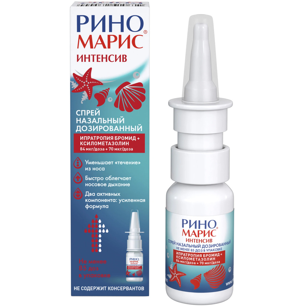 Симпатомиметические препараты вызывают высвобождение катехоламинов, в том числе норадреналина, обладающего сосудосуживающим эффектом, вследствие чего повышается артериальное давление. При значительном повышении артериального давления лечение препаратом Риномарис® Интенсив следует отменить и провести симптоматическое лечение. При сопутствующем назначении других препаратов, обладающих антихолинергической активностью, возможно усиление антихолинергического эффекта ипратропия бромида. Вышеуказанные взаимодействия изучались индивидуально для обоих действующих веществ, входящих в состав препарата Риномарис® Интенсив. В комбинации для обоих действующих веществ вышеуказанные взаимодействия не изучались.