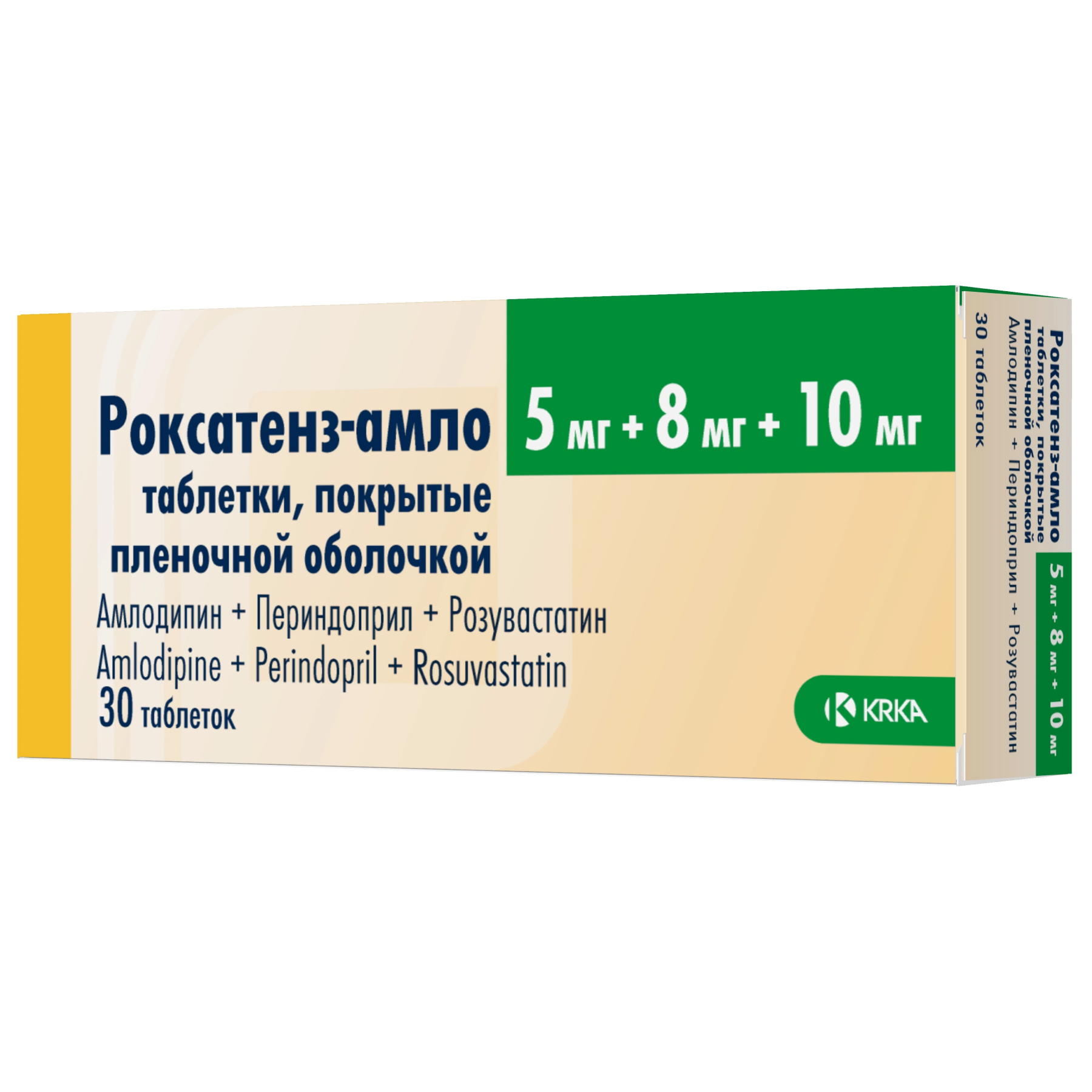 Каждая таблетка содержит 6,934 мг амлодипина безилат, эквивалентно амлодипину 5 мг, 8 мг периндоприла эрбумин и 10,395 мг розувастатина кальция, эквивалентно розувастатину 10 мг.