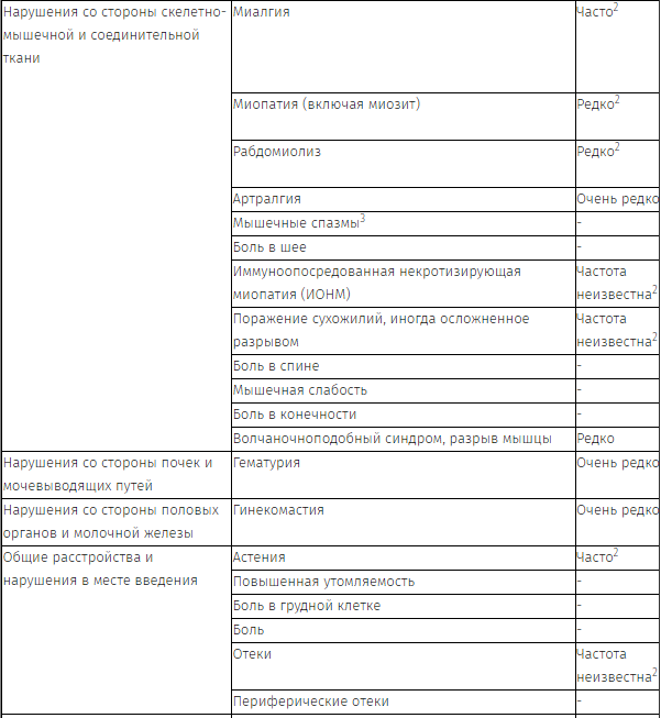 О влиянии на скелетную мускулатуру, например, о развитии миалгии, миопатии и, в редких случаях, рабдомиолиза сообщалось у пациентов, которые получали лечение розувастатином во всех дозах, но в особенности при приеме доз, превышающих 20 мг в сутки. Об очень редких случаях развития рабдомиолиза сообщалось на фоне применения эзетимиба в комбинации с ингибиторами ГМГ-КоА редуктазы. Фармакодинамическое взаимодействие нельзя исключить, и при их комбинированном применении следует соблюдать осторожность. Как и при применении других ингибиторов ГМГ-КоА- редуктазы, частота развития рабдомиолиза, связанного с приемом розувастатина, при пострегистрационном применении выше при приеме дозы 40 мг в сутки.