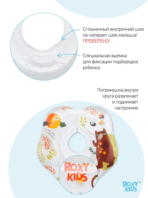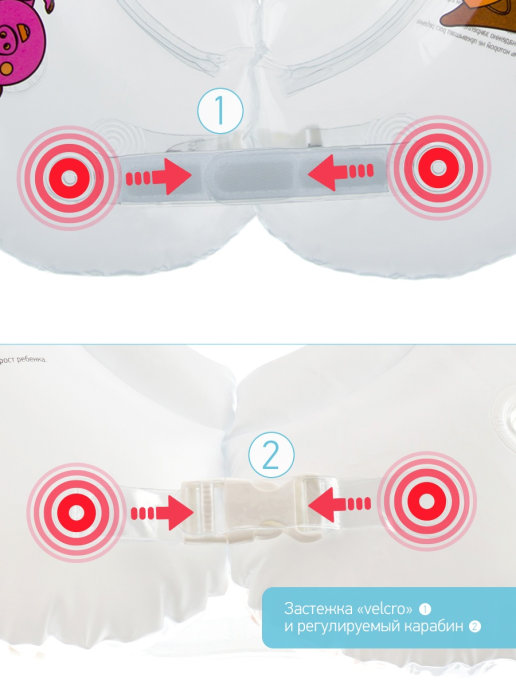 Круг для купания новорожденных предназначен для водных процедур с самого рождения. C этим кругом водные процедуры пройдут весело и просто. Ваш малыш будет свободно держаться на воде, шевелить ручками и ножками, при этом нос и рот будут защищены от попадания воды, а звенящая погремушка внутри развеселит вашего карапуза. Круг оценят родители, так как им не придется все время стоять в согнутом положении. Надежная фиксация обеспечивается двумя удобными регулируемыми липучками и карабином. Места крепления застежек дополнительно усилены. Круг имеет мягкий внутренний шов, который не будет натирать шею. Анатомическая выемка для подбородка позволяет удобно зафиксировать голову. Может использоваться в домашних условиях и на открытых водоемах глубиной не более 1 метра. В конструкции предусмотрен ниппель с обратным клапаном, который удержит воздух даже с открытым колпачком. Соответствует европейским стандартам качества и безопасности детских товаров.