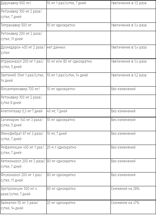 Таблица 1. Влияние сопутствующей терапии на экспозицию к розувастатину (AUC, данные приведены в порядке убывания)