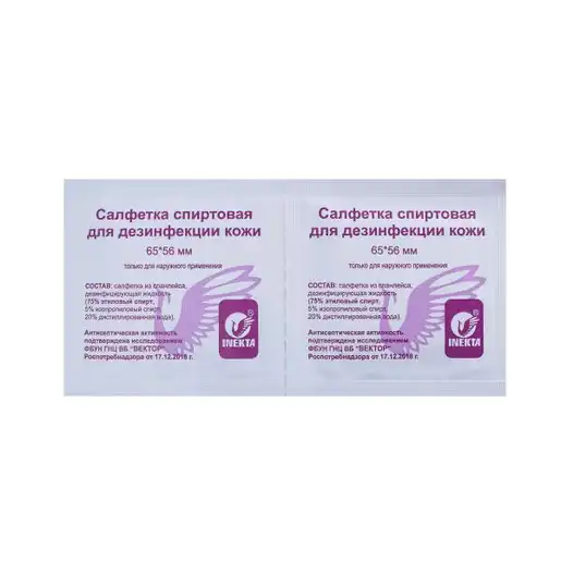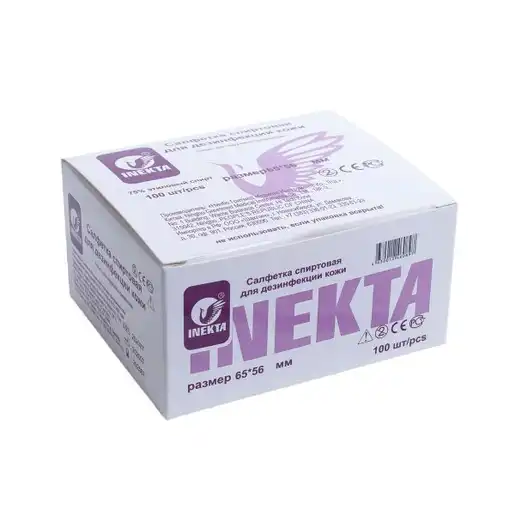 Салфетка инъекционная спиртовая одноразовая Inekta 65*56 мм герметично упакована в индивидуальный пакет.