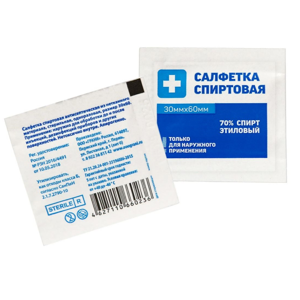 Салфетка спиртовая, антисептическая, стерильная «ООО Грани» из нетканого материала обеспечивает надежную обработку кожи и поверхностей.