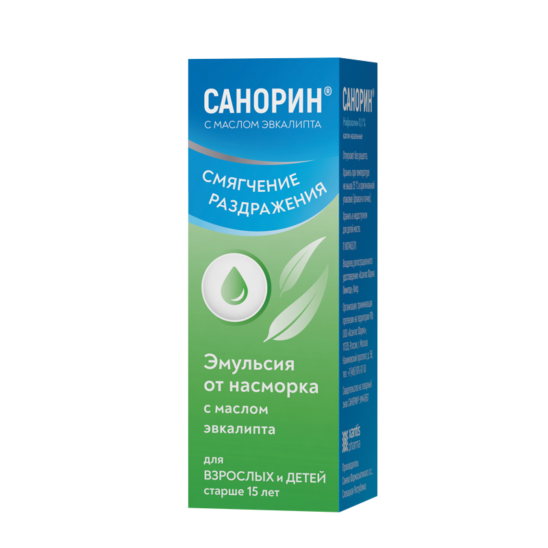 Симптомы: длительное или частое введение препарата Санорин с маслом эвкалипта в носовую полость может вызвать набухание слизистой оболочки носа и ощущение его заложенности. Опасность передозировки (особенно в случае проглатывания) препарата Санорин с маслом эвкалипта возникает у детей младшего возраста и может вызвать угнетение ЦНС, проявлениями которого являются сонливость, понижение температуры тела, повышение потоотделения, замедление ЧСС, повышение АД или его последующее понижение, крайне редко - кома.