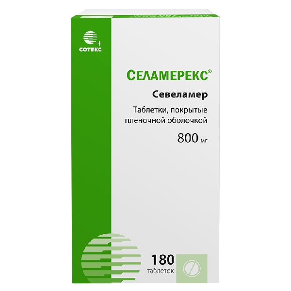 Активным веществом препарата СЕЛАМЕРЕКС® является севеламер - невсасывающийся в желудочно-кишечном тракте фосфатсвязывающий полимер, не содержащий металлов и кальция. Севеламер состоит из множества аминогрупп, отделенных одним атомом углерода от полимерного каркаса, которые протонируются в желудке. Эти протонированные аминогруппы связывают отрицательно заряженные ионы, такие как фосфаты, поступающие с пищей в кишечник. Севеламер связывает фосфаты в желудочно-кишечном тракте, уменьшает их всасывание и благодаря этому снижает концентрацию фосфора в сыворотке крови. При применении препаратов, связывающих фосфаты, необходимо регулярно контролировать концентрацию фосфора в сыворотке крови. Терапевтическая эквивалентность севеламера карбоната, применявшегося в виде таблеток и порошка 3 раза в сутки, и севеламера гидрохлорида, а, следовательно, и эффективность контроля концентрации фосфора в сыворотке крови у пациентов с хронической почечной недостаточностью (ХПН), находящихся на гемодиализе, были показаны в двух рандомизированных перекрестных клинических исследованиях.