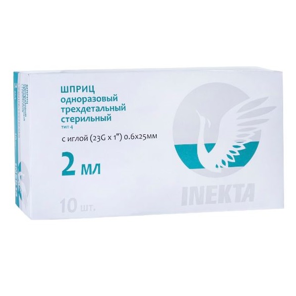 Шприц 2 мл одноразовый трехкомпонентный с иглой 0,6х25 (23G*1) стерильный. Состоит из прозрачного градуированного цилиндра с разъемом LUER-slip, штока-поршня, уплотняющего кольца-манжеты. Каждый шприц выпускается в комплекте с иглой. Прозрачный корпус и четкость градуированной шкалы гарантируют точную дозировку и контроль уровня лекарства, а также легкое выявление случайно попавших воздушных пузырей. Шкала имеет дополнительную градуировку до 2,5 мл. Наличие силиконовой смазки на поршне и внутри полости цилиндра обеспечивает плавность хода. Игла из стали высокого качества имеет тройную лазерную заточку острия, надета на конус. Индивидуальная упаковка «полибэг» из плотного полипропилена обеспечивает видимость шприца до вскрытия упаковки и свидетельствует о ее целостности. Срок годности 5 не менее лет.