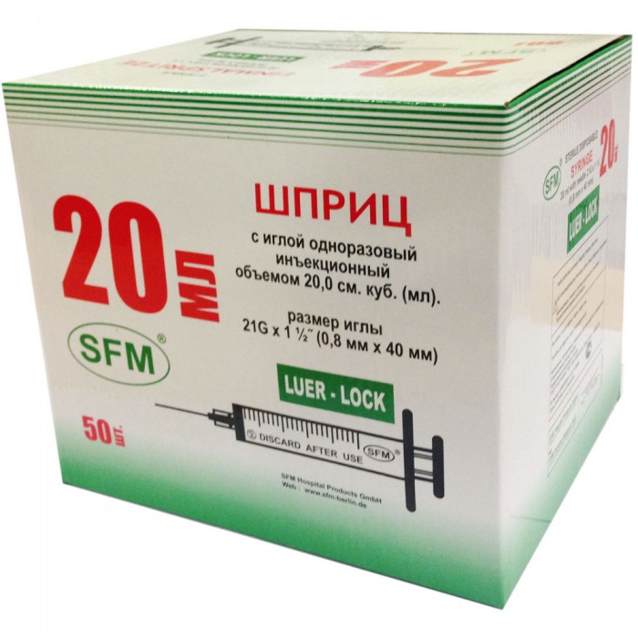 Шприц 2-х компонентный объемом 20 мл – это медицинское изделие, которое используется для инъекций. Шприц стерильный инъекционный имеет индивидуальную упаковку и предназначен для одноразового использования. Он выполнен из качественного и безопасного материала. Игла 21G (0,8х40мм) - съёмная, приложенная. Игла при введении не травмирует ткани, за счёт покрытия специальной смазкой. Положение Луер-крепления (конуса цилиндра) шприца - эксцентрическое (расположен сбоку цилиндра шприца). Цена деления шкалы 1 мл.
