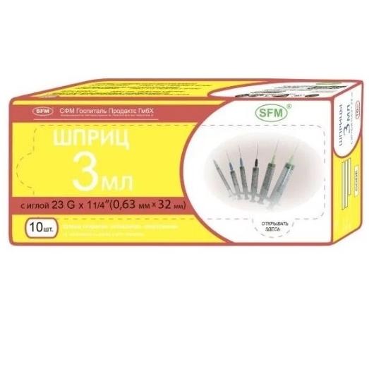 Шприц предназначен для всех видов инъекций в условиях стационара, амбулаторных и домашних условиях. Используется для внутривенного и внутримышечного введения, инъекционных лекарственных препаратов. Игла 23G (0,6х30 мм) - съёмная, надетая на шприц. Инъекционная игла имеет трёхгранную заточку острия, обеспечивающую легкий и комфортный прокол ткани. Соединение шприца с иглой - тип Luer. Положение луер-крепления (конуса цилиндра) шприца - концентрическое. Поверхность иглы становится гладкой в результате полировки и шлифовки, а также покрытия специальной смазкой. Игла при введении не травмирует ткани. Тонкостенная конструкция иглы позволяет комфортно вводить густые и масляные лекарства. Объем шприца 3 мл. Шкала имеет градуировку до 3 мл. Стопорное кольцо исключает случайное извлечение поршня из цилиндра и вытекание лекарства для внутримышечных инъекций. Упаковка - блистер. Общая вместимость шприца несколько превышает номинальный объем (не менее, чем на 10 %).Прозрачный цилиндр облегчает контроль объема и прозрачности медикамента. Индивидуальная упаковка обеспечивает сохранность стерильности. Нетоксично, апирогенно.