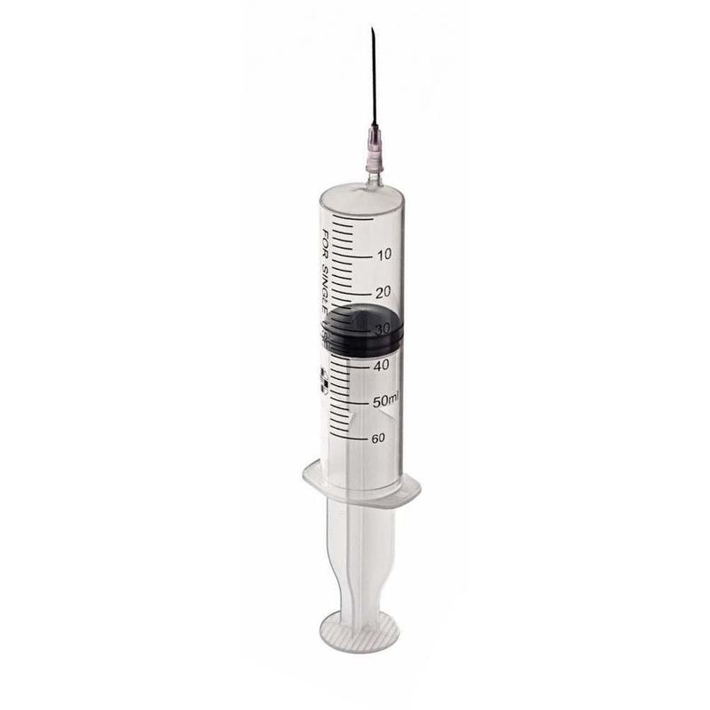 Шприц трехкомпонентный SF-Medical 50 мл 18G (1.2×40 мм, 1 штука в упаковке). Предназначен для лекарственных инъекций. Цилиндр имеет высокую степень прозрачности, что позволяет точно контролировать набор лекарственного препарата. Плавный ход поршня обеспечивает безболезненное введение препарата. Стопорное кольцо снижает риск утечки жидкости и предотвращает случайное выдергивание поршня при наборе препарата. Приложенная игла с трехгранной лазерной заточкой и силиконовым покрытием обеспечивают безболезненность инъекции. Тип крепления иглы Luer или Luer Lock в зависимости от проводимой манипуляции. Материал: полипропилен. Упаковка: блистер. Стерилизация — этиленоксид. На корпусе шприца несмываемая шкала с ценой деления 10 мл.