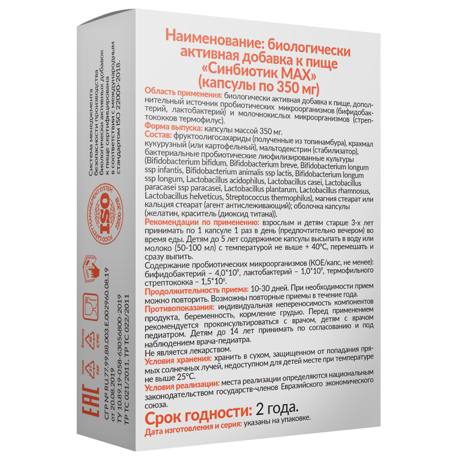 Синбиотик МАХ содержит не менее 4,0 млрд. КОЕ Бифидобактерий, не менее 1,0 млрд. КОЕ Лактобактерий, а также не менее 10 млн. КОЕ бактерий термофильного стрептококка.